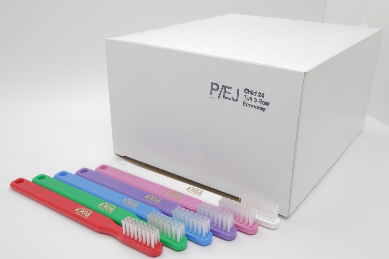 The junior 3 row 24 tuft bristle toothbrush is a children's brush that features a 20mm shorter handle and head (see image for size reference). Designed for smaller mouths aged twelve months and up. Just what children needs to start them off on the right track to keep their mouth healthy through daily personal oral hygiene.